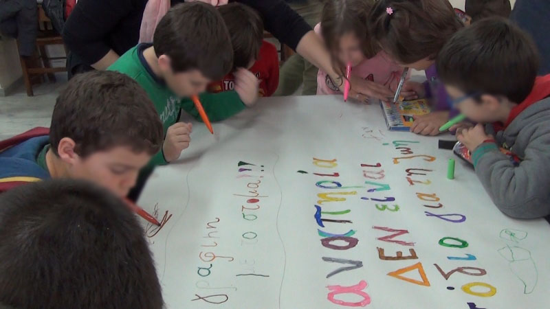Οι μαθητές όλου του σχολείου, χωρισμένοι κατά τάξεις και  εφοδιασμένοι με τις μπογιές τους(ξυλομπογιές, μαρκαδόρους, κηρομπογιές, παστέλ) κάθισαν κυκλικά γύρω από χαρτί του μέτρου και με την καθοδήγηση της Εικαστικού μας, ζωγράφισαν συνθήματα, για τη διαφορετικότητα και το δικαιωμα στη ζωή των Ατόμων με αναπηρία.