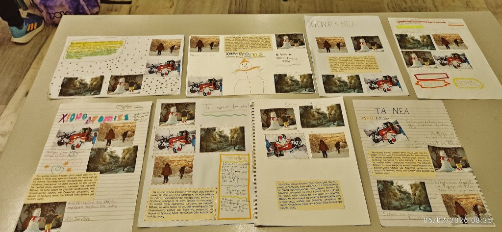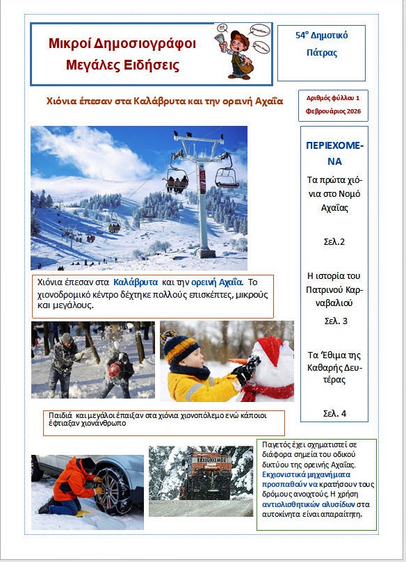 Έτσι,  με την ίδια θεματολογία της άσκησης «Τα πρώτα χιόνια έπεσαν στο νομό μας»  φτιάξαμε μαζί στην τάξη ηλεκτρονικά ένα πρωτοσέλιδο, με δικό μας κείμενο. Το κείμενο μας,  αναφερόταν στα πρώτα χιόνια που έπεσαν στον νομό Αχαΐας,  τις ημέρες των Γιορτών.